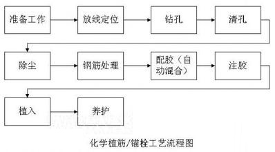 定位 →鉆孔 → 清孔 → 鋼材除銹 → 錨固膠配制 → 植筋 → 固化、保護(hù) → 檢驗
